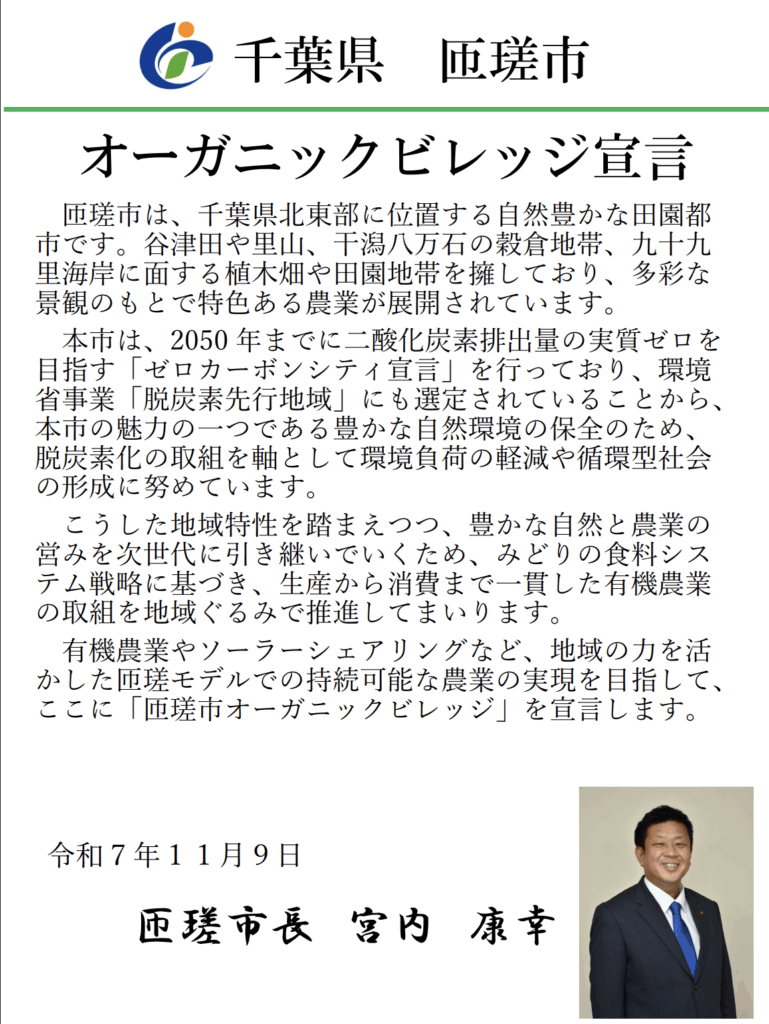 未分類2025年11月10日 匝瑳市が「オーガニックビレッジ宣言」を行いました! 【オーガニックビレッジ宣言】 令和7年11月、本市はみどりの食料システム戦略に基づいて「匝瑳市有機農業実施計画」を策定し、「匝瑳市オーガニックビレッジ宣言」を行いました。 有機農業や低農薬栽培などの環境にやさしい農業の取り組みを地域ぐるみで推進します。 詳細は下記URLから ↓ https://www.city.sosa.lg.jp/sp/page/page005455.html?utm_source=line&utm_medium=social&utm_campaign=message