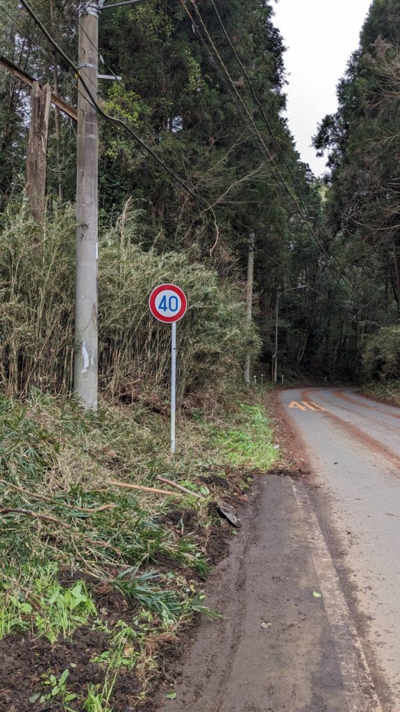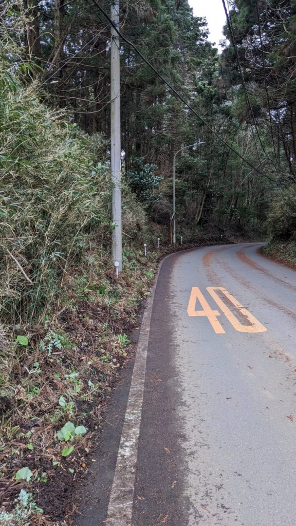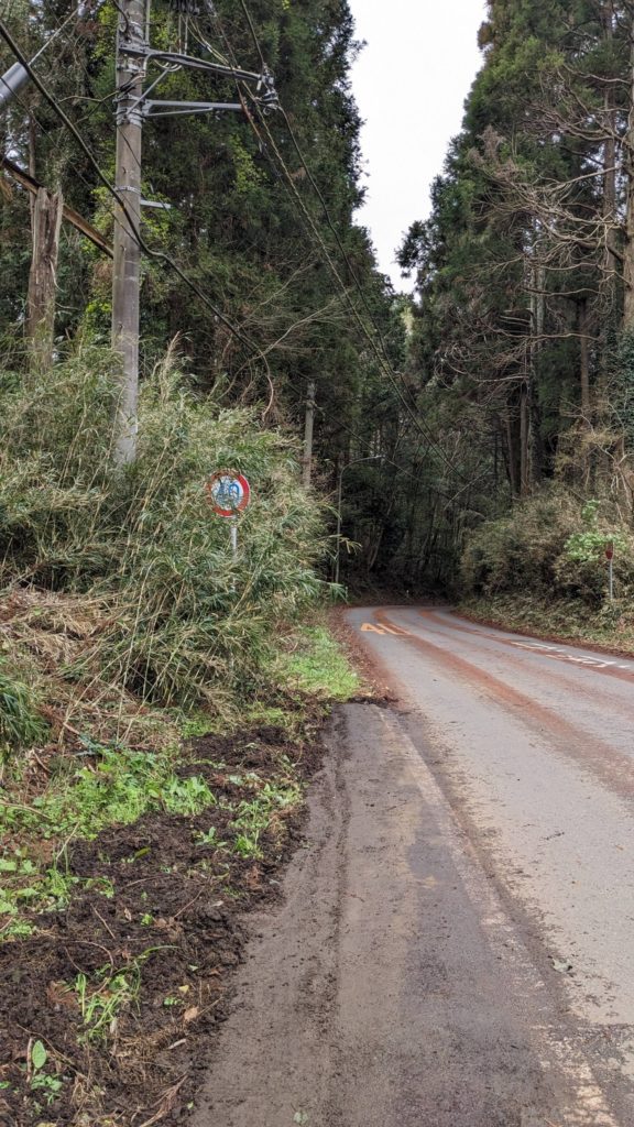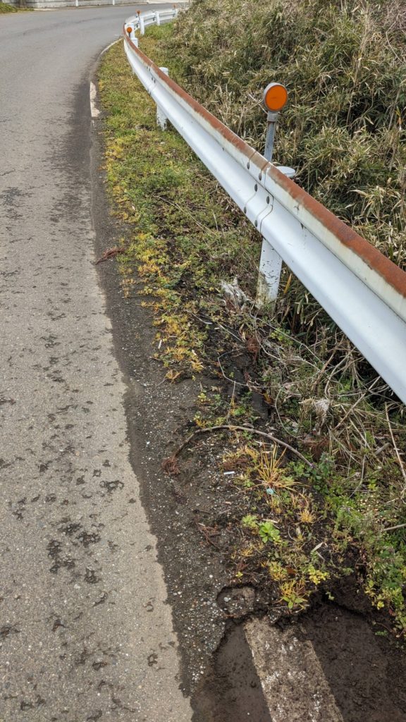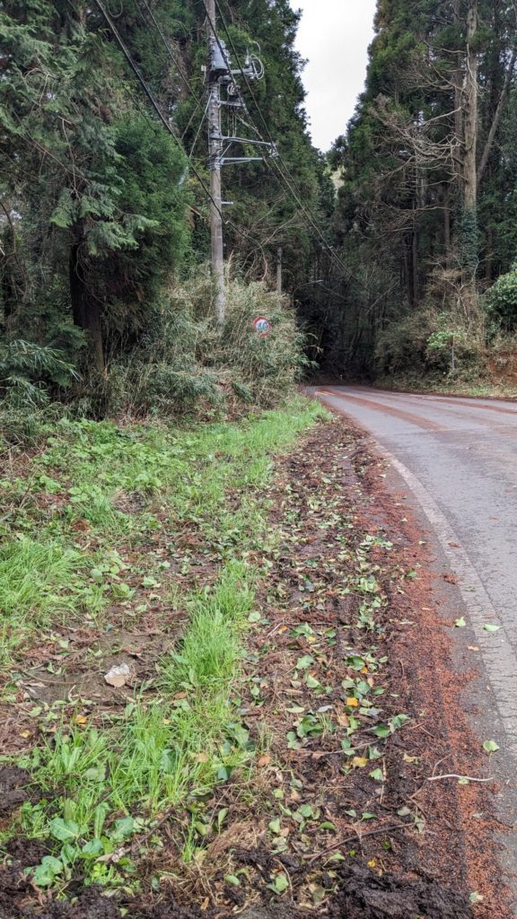 県道に積もった落ち葉は土になり、元々狭い道がさらに狭くなるばかりでなく、さらにそこから草が生えてくるので、益々狭くなります。